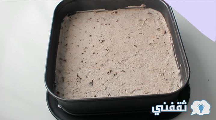 • بعد ذلك ندخل القالب في المجمد ونتركه حتى تتماسك طبقة البسكويت.