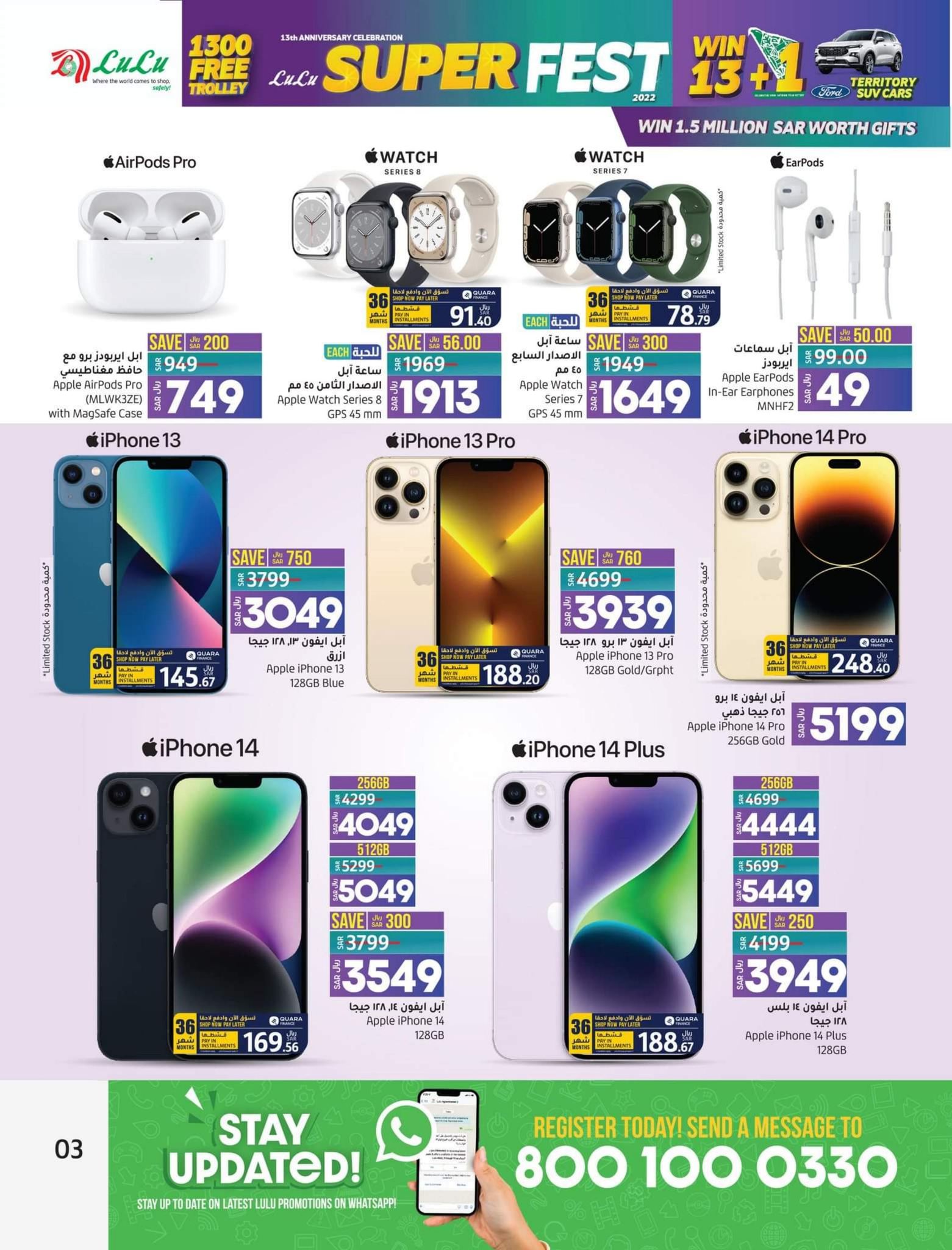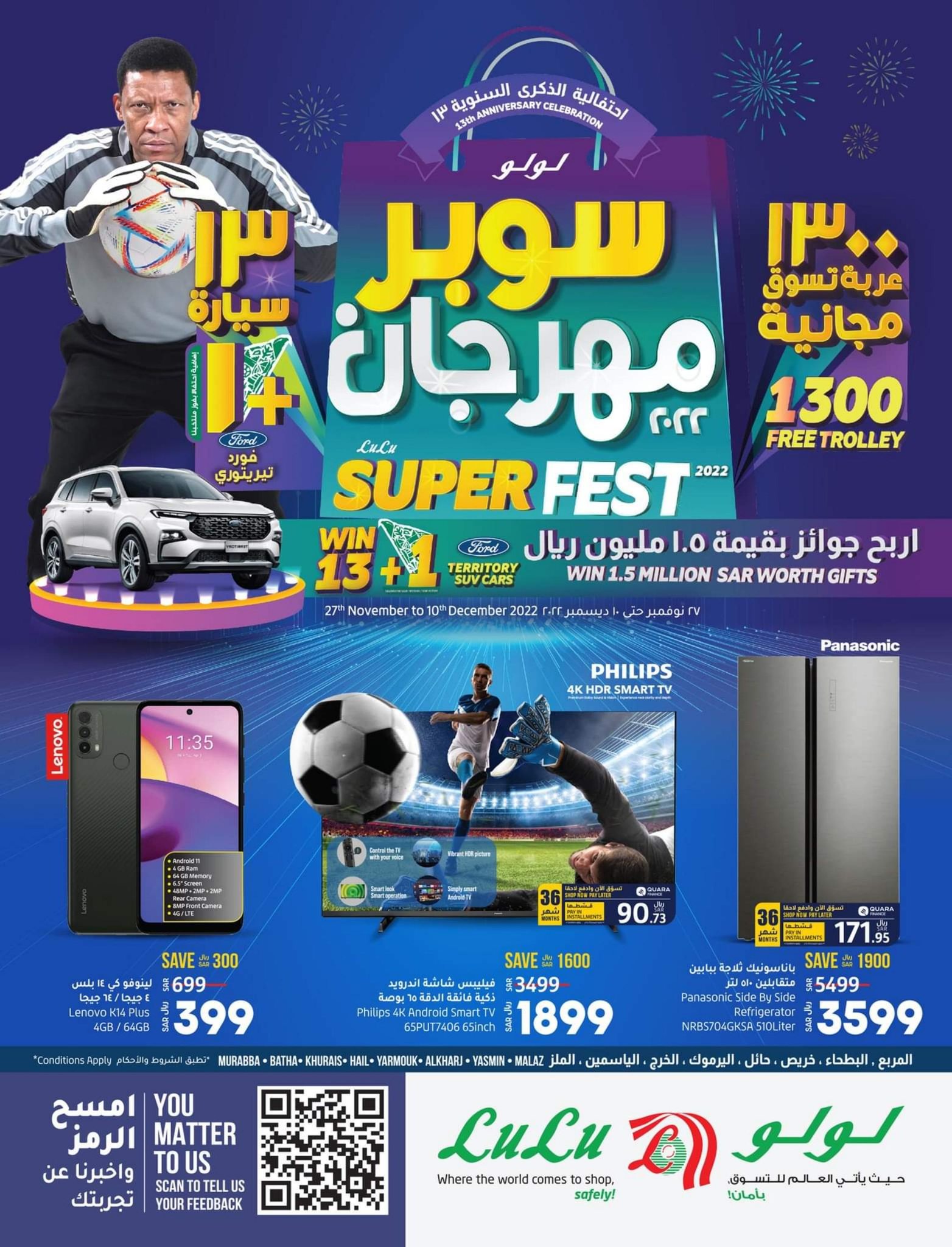 عروض لولو هايبر ماركت تقدم أقوى عروض وتخفيضات نهاية العام في مهرجان السوبر على الأجهزة الكهربائية الثقيلة والصغيرة بالإضافة إلى تخفيضات جبارة على مجموعة هائلة من الجوالات والأجهزة اللوحية والإلكترونيات، مع العلم أن هذه العروض متوفرة في جميع فروع لولو ماركت الرياض وحائل والخرج بداية من يوم 27 نوفمبر وحتى يوم 10 ديسمبر 2022، فبادروا بالسرعة واغتنام الفرصة.
