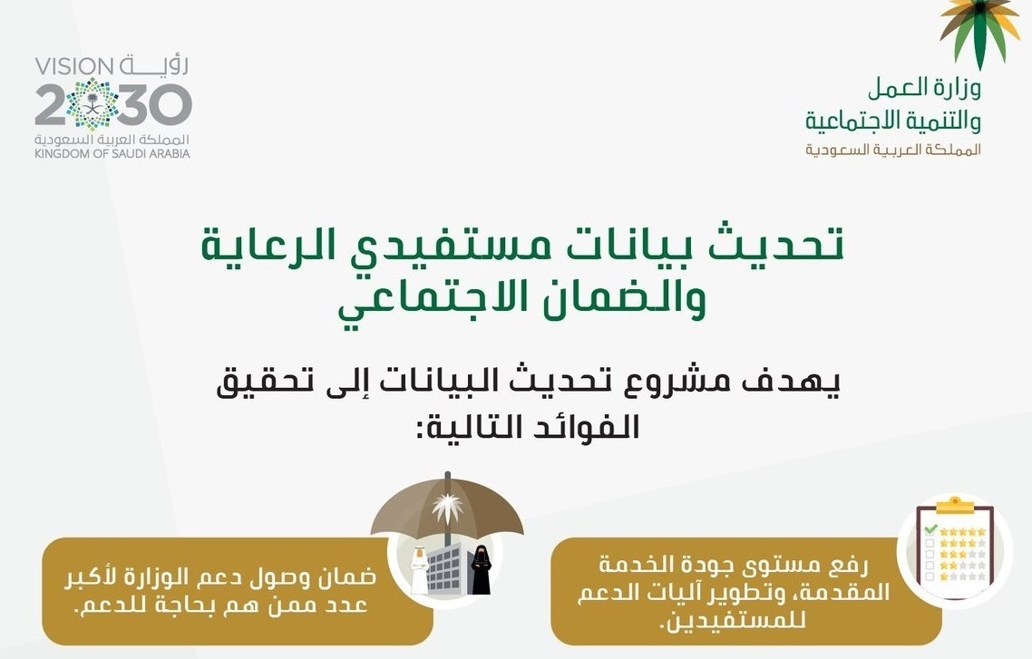 حيث في الآونة الاَخيره استهدفت وزارة الموارد البشرية والتنمية الاجتماعية المواطنين الذين يستفيدون من خدمات الضمان الاجتماعي من اجل تحديث بياناتهم وعدم تطرق المواطنين إلي الأشخاص الذين يأخذون أموالاً من اجل تحديث بياناتهم.