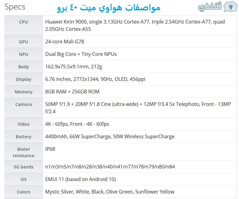 مواصفات جوال هواوي ميت 40 برو Huawei Mate 40 pro:
