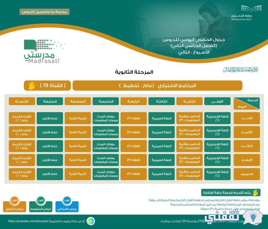 قامت وزارة التعليم السعودية بالإعلان عن جدول حصص الدروس اليومية للمرحلة الثانوية (البرنامج الاختياري) من الأسبوع الثاني للفصل الدراسي الثاني، والتي تتم إذاعتها عبر قناة عين التعليمية وكان كالتالي