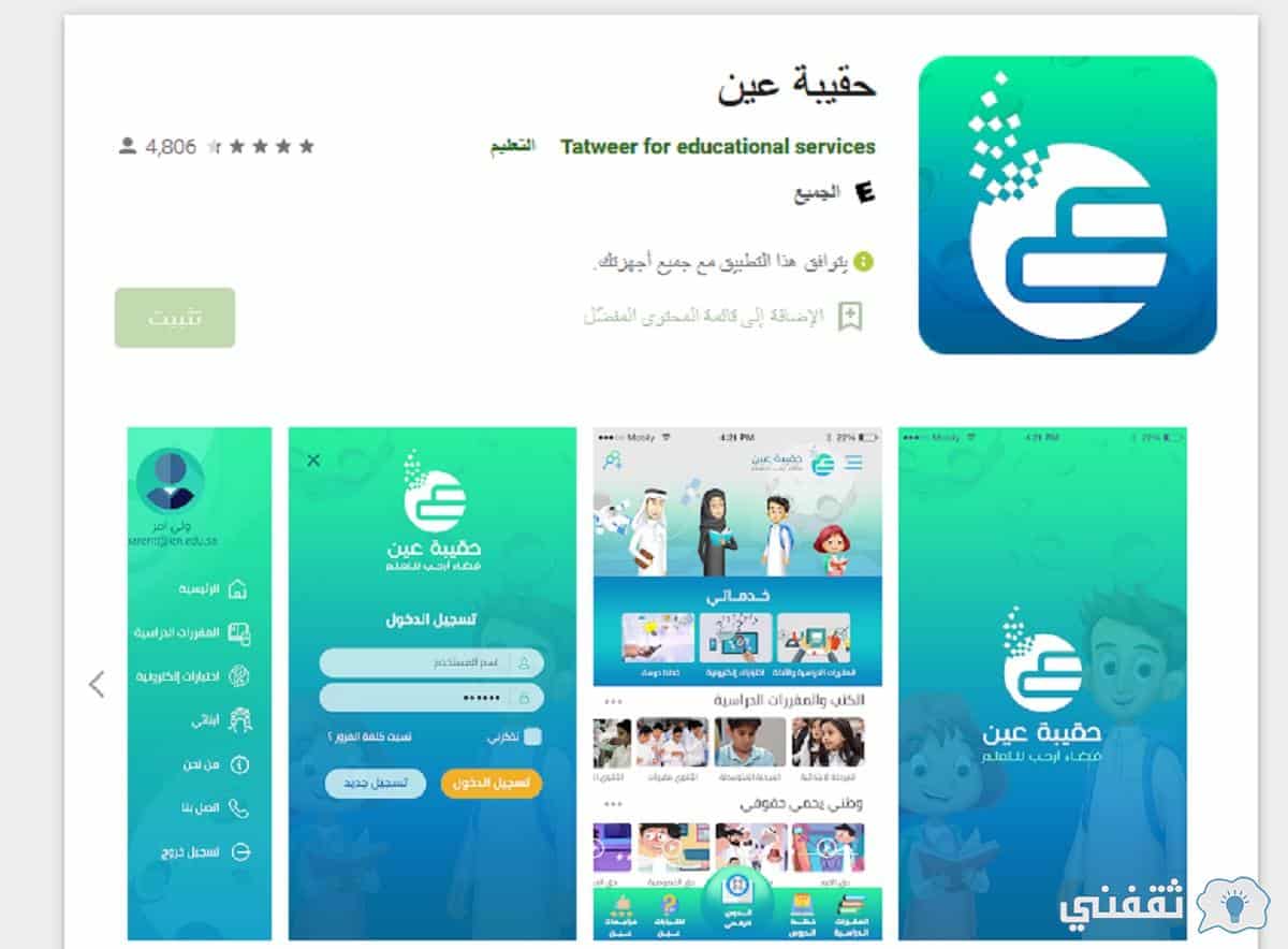 كما وفرت الوزارة أيضاً تطبيق حقيبة عين ضمن التطبيقات التي يمكن تحميلها من متجر جوجل، ويوفر التطبيق إمكانية تحميل جميع الكتب الدراسية بالإضافة إلى أدلة المعلمين وتصفحها وتحميلها إلكترونياً، ويتميز التطبيق بالتصميم المميز الذي يناسب احتياجات الطلاب ورغباتهم، حيث يحتوي على الألوان المبهجة والصور الرائعة والمعلومات القيمة، ذلك بالإضافة إلى العديد من المميزات الأخرى التي جعلت الطلاب يقبلون بقوة على تنزيله.