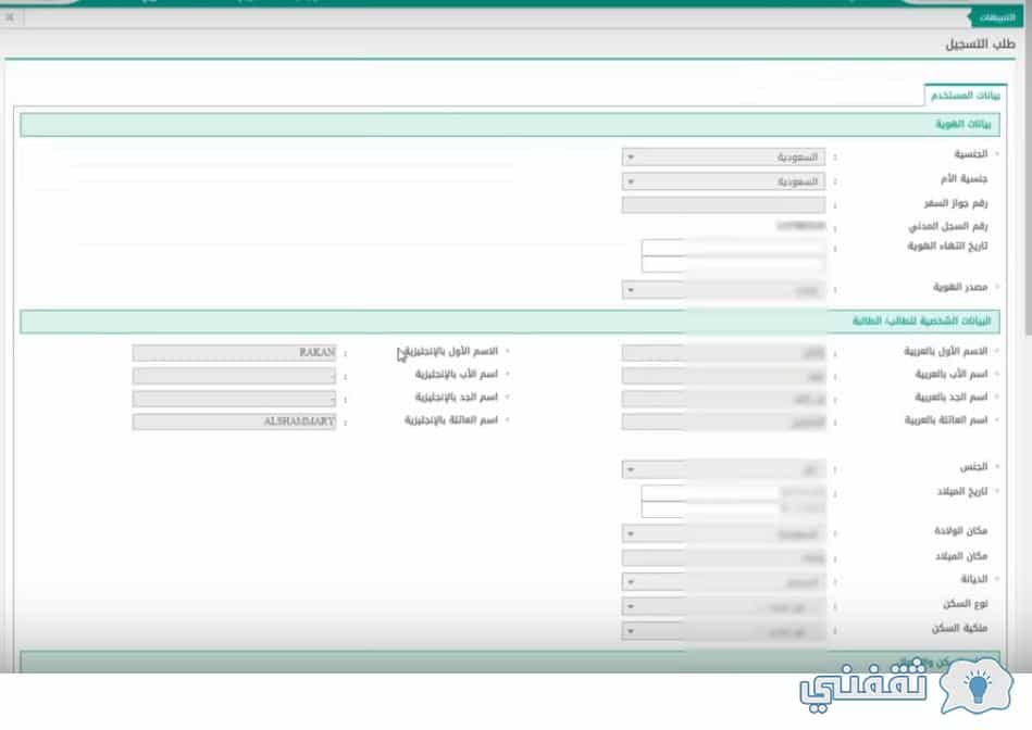 - عليك ملء البيانات المطلوبة الخاصة بالطالب ثم النقر على زر التالي، إذا كانت البيانات التي قمت بكتابتها وتاريخ ميلاد الطالب صحيحاً، فسوف يتم تحميل بيانات الطالب تلقائياً ما عدا اللغة الإنجليزية سيتوجب عليك كتابة اسم الطالب والجد والعائلة باللغة الإنجليزية حسب المطلوب.