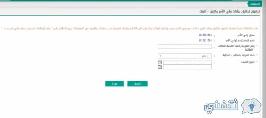 - ستظهر لك صفحة أخرى خاصة بمطابقة بيانات الابن أو البنت مع بيانات ولي الأمر، قم بملء البيانات المطلوبة وهي سجل ولي الأمر، واسم المستخدم الخاص به، رقم الهوية رخصة الإقامة للطالب/ الطالبة، صلة القرابة بالطالب/ الطالبة، وتاريخ الميلاد.