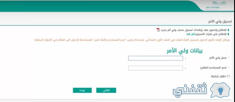 - ستظهر لك صفحة أخرى قم بتعبئة بيانات ولي الأمر المطلوبة وهي (رقم الهوية، اسم المستخدم المقترح)، ثم انقر زر التالي.
